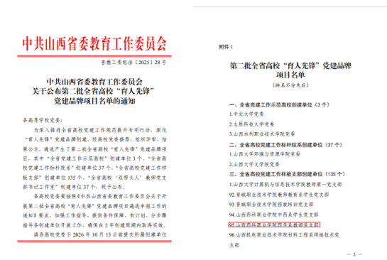 近日,山西省委教育工作委员公布了第二批全省高校“育人先锋”党建品牌项目名单,我系教师党支部凭借扎实的党建基础、鲜明的育人特色与突出的建设成效,成功入选“全省高校党建工作样板支部”创建单位。