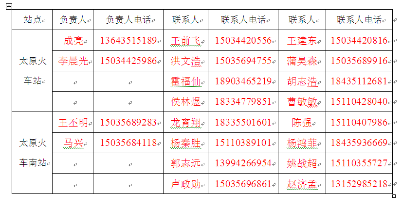 根据学院2015年迎新工作方案安排,学院定于10月9日-10日(每日早8:00-晚20:00)开学报到期间,分别在太原火车站、太原火车南站安排专人接站,为方便考生及家长乘坐学院接送车来校,现将接站人员联系方式告知如下。