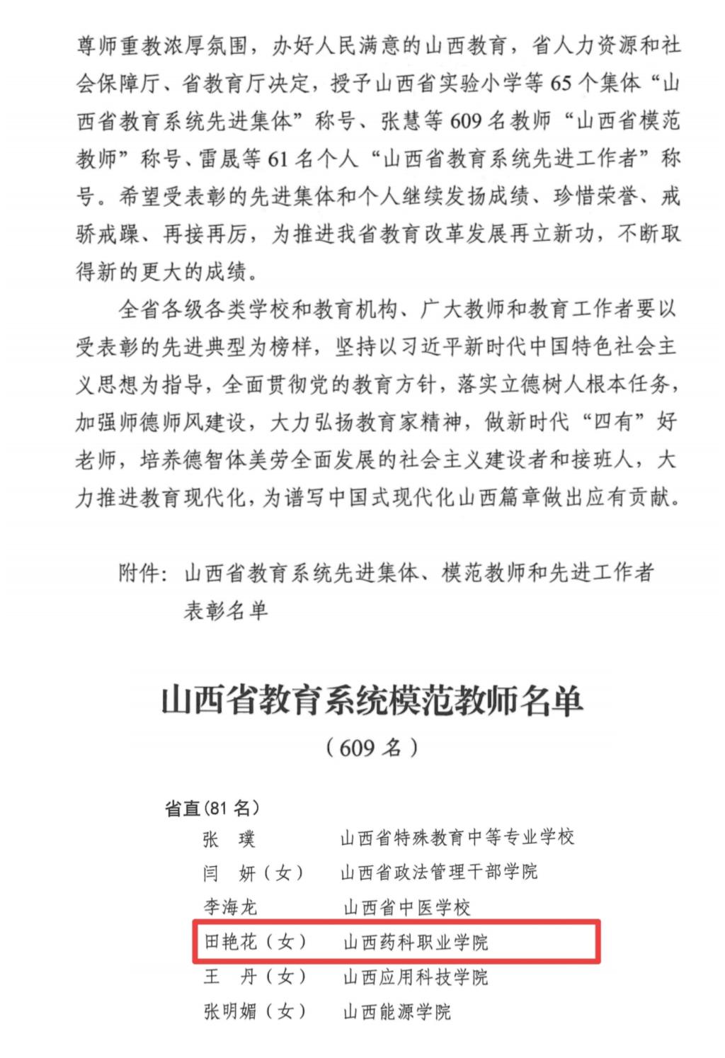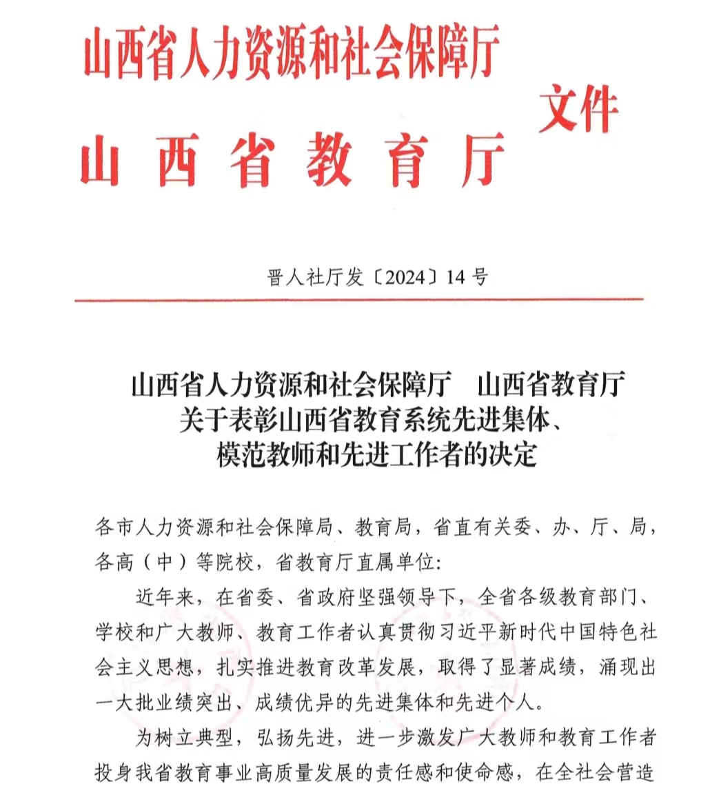 近日,山西省人力资源和社会保障厅、山西省教育厅联合下发《关于表彰山西省教育系统先进集体、模范教师和先进工作者的决定》(晋人社厅发[2024]14号),我院田艳花老师荣获“山西省教育系统模范教师”称号。