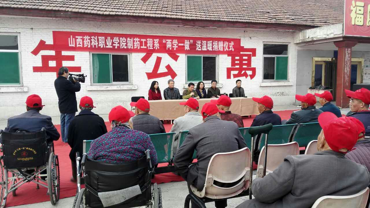 落叶时节又重逢,情谊蓁蓁送温情!为弘扬中华民族尊老敬老爱老的传统美德,给孤寡老人送去冬日的温暖。11月18日下午,制药工程系党总支师生一行六人再次来到暑期社会实践志愿服务基地——太谷县福康老年公寓,开展“两学一做” 情系孤寡老人爱心捐赠活动。太谷县民政局、红十字会负责人出席活动现场。太谷电视台进行现场采访报道。