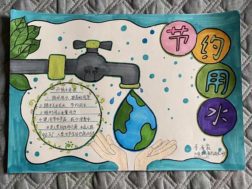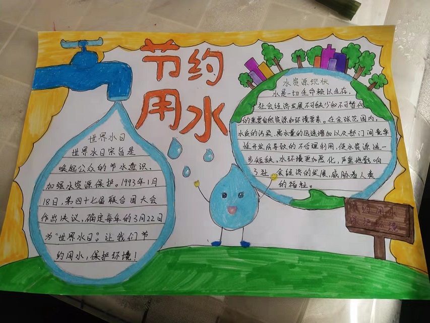活动中,同学们踊跃报名,积极参与,按照方案要求,紧扣活动主题,围绕节水知识、节水新理念等内容等进行创作。节约用水是每个公民应尽的责任和义务、是实施可持续发展战略的重要措施、是保护地球生态的重要措施,同学们通过自己的绘画手抄报作品呼吁身边的每一个人珍惜水资源、保护环境,将“惜水”、“爱水”、“护水”的良好习惯融入到日常生活中。