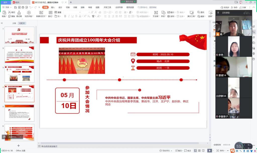 团课伊始,各班团支书利用线上会议,通过线上交流、短视频宣传、实践活动等多种形式开展学习讨论。学习中团员青年们了解到,习近平总书记发表的重要讲话,高度评价了百年来各级共青团组织带领团员青年为祖国和人民不懈奋斗的光荣历史和辉煌业绩,深刻总结了中国共青团一百年来形成的宝贵经验,对未来共青团进一步开拓创新、再建新功提出了明确要求,为当代青年面向未来、健康成长指明了方向,寄托了党和国家对青年一代的深切关怀和殷切期望,意蕴深厚、催人奋进。