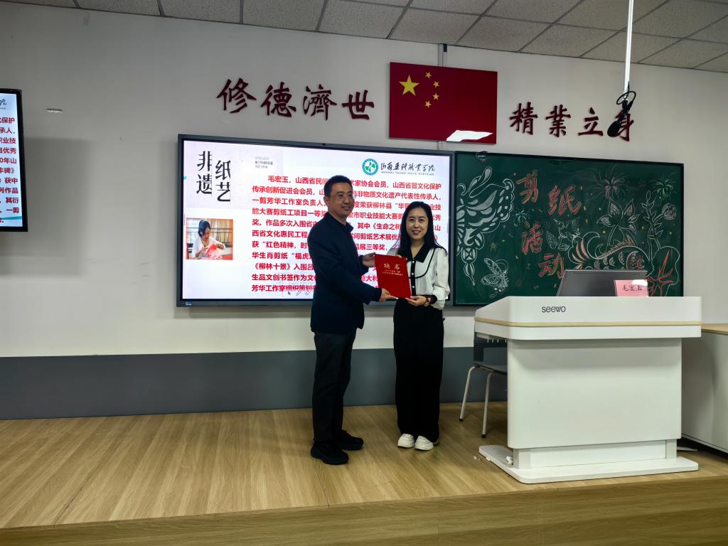 为弘扬中华优秀传统文化,加强学生对非物质文化遗产的认识和保护意识,4月9日下午,制药系邀请山西省民间剪纸艺术家协会会员,山西省晋文化保护传承创新促进会会员,山西省柳林县非物质文化遗产代表性传承人,一剪芳华工作室创始人毛宏玉老师,在学院实验楼旧标本厅为制药系师生开展了一场别开生面的非遗纸艺进校园活动。制药系师生150余人参加了本次活动。