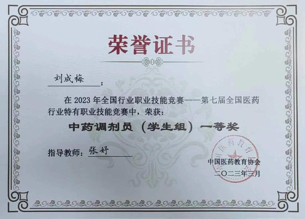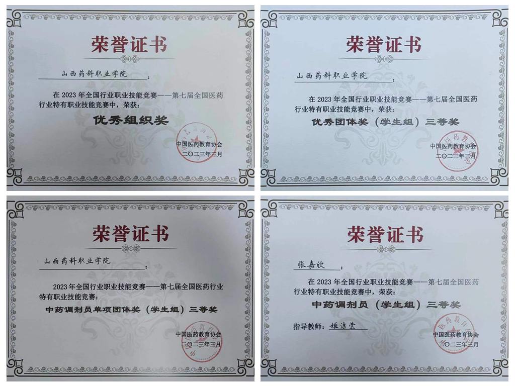 3月23--26日,2023年全国行业职业技能竞赛第七届全国医药行业特有职业技能竞赛中药调剂员赛项在江苏省连云港中医药高等职业技术学校举行,中药系参赛学生刘成梅和张嘉欣分别荣获个人一等奖和三等奖。学院在第七届全国医药行业特有职业技能竞赛中荣获中药调剂员单项团体奖(学生组)三等奖、优秀团体奖(学生组)三等奖、优秀组织奖。