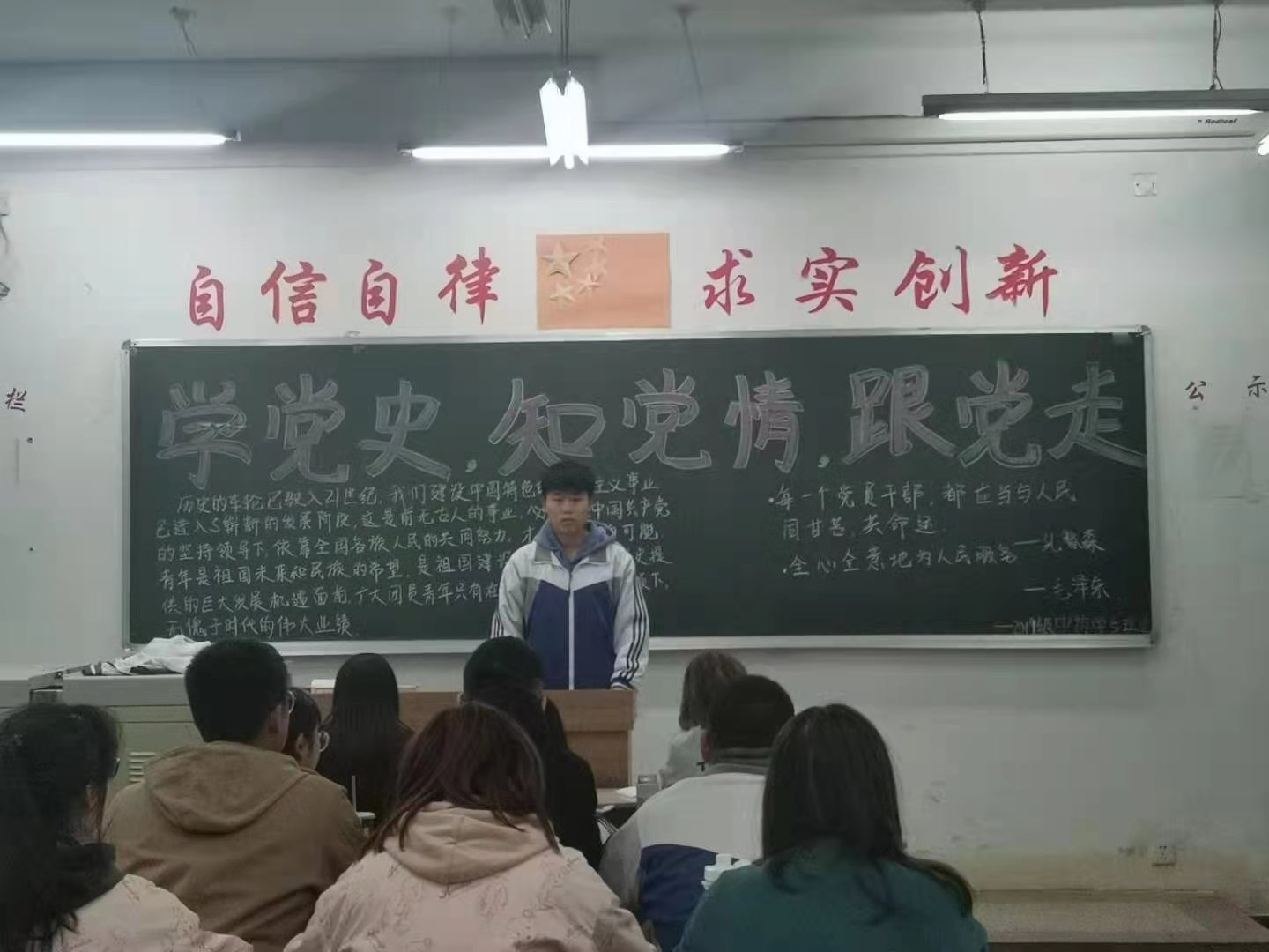 班会中,班长带领同学们再次学习了习近平总书记在党史学习教育动员大会上的重要讲话精神;班干部和学生代表结合自学党史中感触较深的内容,以故事讲述形式,依次分享了共产党历史上重要时刻、重要事件、重要人物,交流了党史学习感想。现场交流气氛热烈、主题鲜明,学员们声情并茂、慷慨激昂,达到了良好的交流效果。