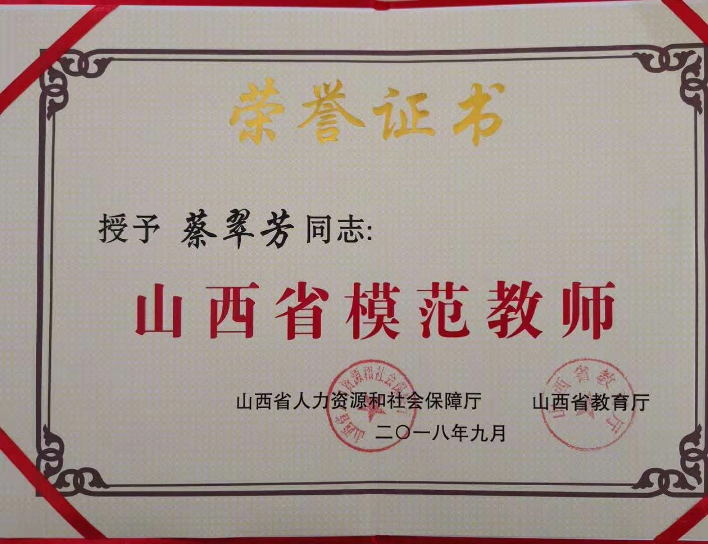 近日,山西省人力资源和社会保障厅、山西省教育厅印发《关于表彰山西省教育系统先进集体和山西省模范教师山西省教育系统先进工作者的决定》,授予全省63个单位“山西省教育系统先进集体”称号,授予全省944名个人“山西省模范教师”称号,授予94名个人“山西省教育系统先进工作者”称号。我院蔡翠芳老师荣获“山西省模范教师”荣誉称号。