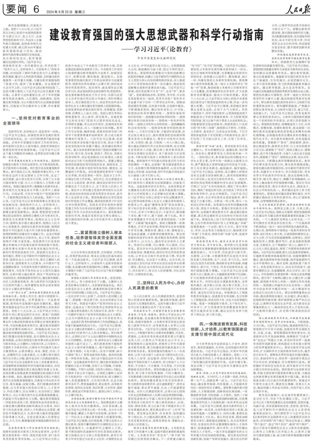 在全国教育大会召开之际,习近平总书记《论教育》出版了。9月25日,中共中央党史和文献研究院在《人民日报》刊发文章《建设教育强国的强大思想武器和科学行动指南——学习习近平〈论教育〉》,一起来看——
