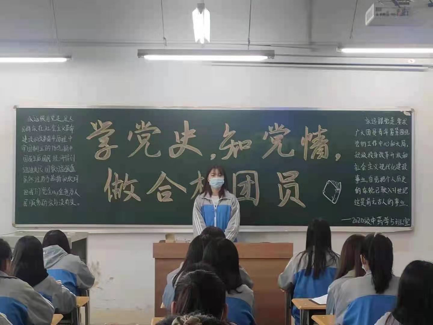 中药系分团委组织各团支部开展了“学党史、知党情、跟党走”主题团课。团课中,团支书带领同学们再次学习了习近平总书记在党史学习教育动员大会上的重要讲话精神;部分团员代表结合自学党史中感触较深的内容,以故事讲述形式,依次分享了共产党历史上重要时刻、重要事件、重要人物,交流了党史学习感想。现场交流气氛热烈、主题鲜明,团员们声情并茂、慷慨激昂,达到了良好的交流效果。