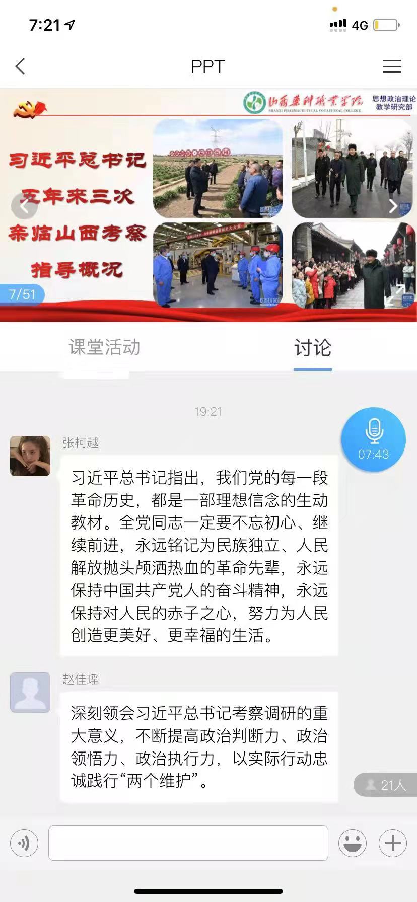 3月6日晚,食品工程系辅导员以“学习习近平总书记考察调研山西重要指示精神”为题组织召开主题班会开展了灵活多样、形式新颖的学习交流活动,带领同学们学习习近平总书记考察调研山西重要指示精神,跟进学习全国两会精神,并对学生们即将开始的线上学习提出了要求,对当下疫情防控工作进行了安排。