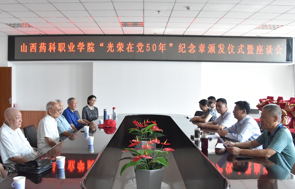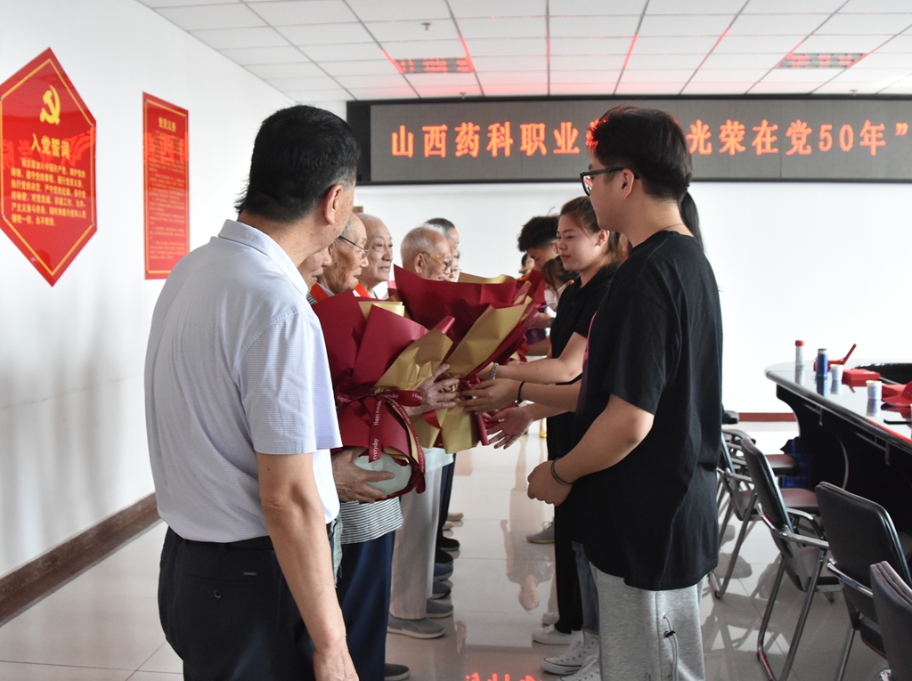 仪式上,与会院领导为老党员依次佩戴“光荣在党50年”纪念章,学生代表为老党员敬献鲜花。面向党旗,全体共产党员重温入党誓词。