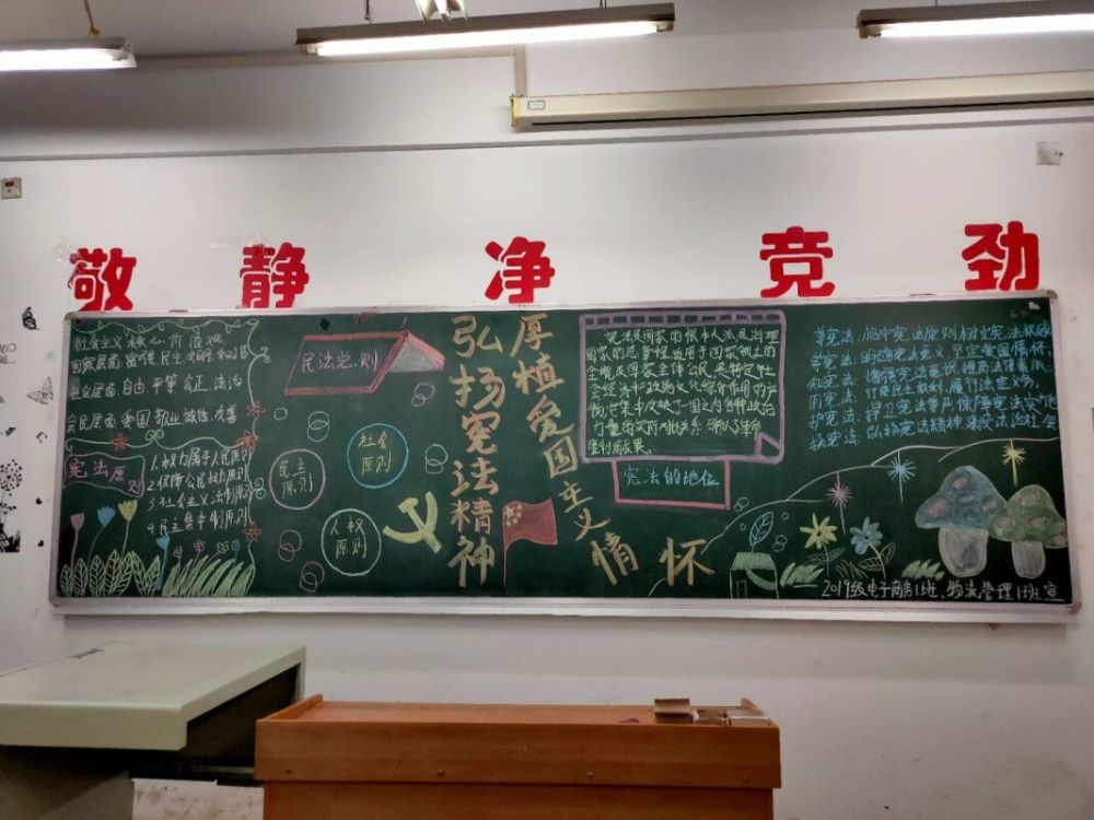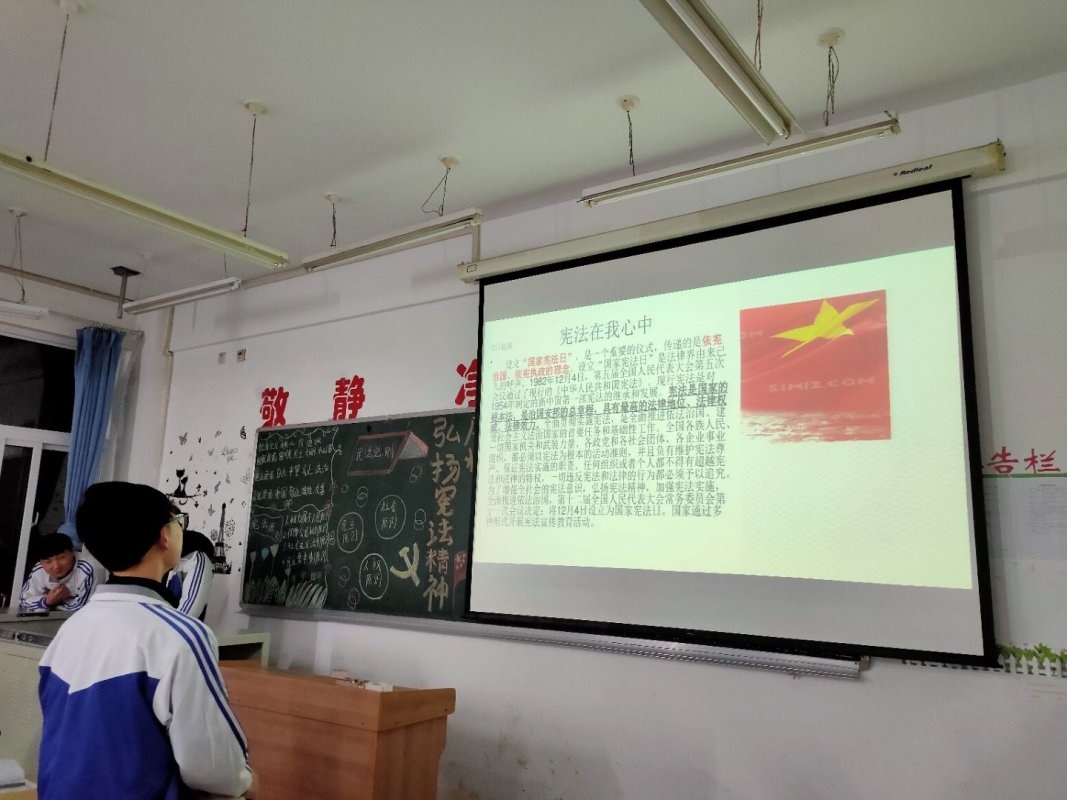 团支书们分别从宪法与国家、宪法与生活两方面,深入浅出地宣讲宪法,同学们也积极互动,现场气氛十分活跃。19级电子商务1班的邢晓荣同学进行题为《严于律己,做遵纪守法好青年》班级演讲。她说“勿以善小而不为,勿以恶小而为之。”让我们携起手来,严格遵守各项法律、法规,自觉抵制各种不良现象,一起学法、知法、守法。用我们美好的心灵去净化身边的丑恶,用我们灵巧的双手共建人类的文明,共创和谐校园!18级药品经营与管理1班全体同学收看教育部全国青少年普法网网络直播,与教育部北京主会场一同诵读《中华人民共和国宪法》的部分条款,铿锵有力的声音回荡在教室里,庄严而又神圣。