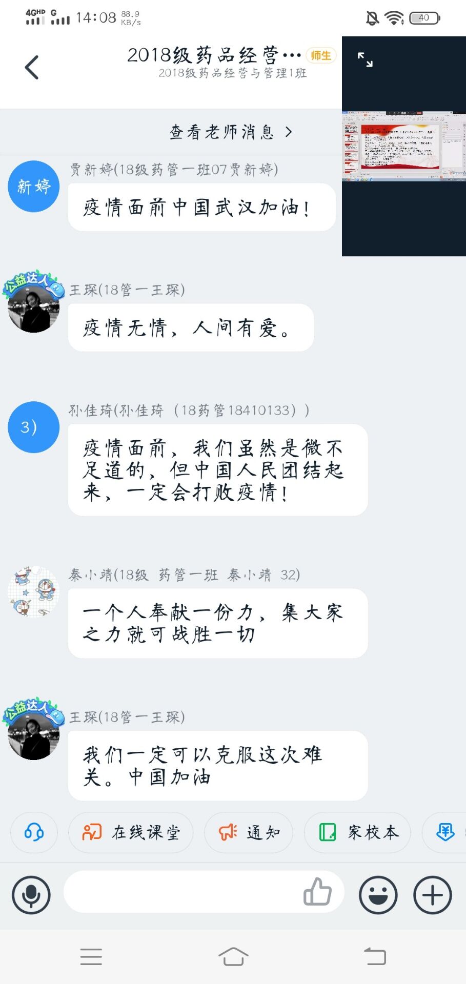 团课伊始,每位团支书将提前准备好的团课PPT发在了网上平台的讨论区中供同学们观看,同学们相继在对话框中展开了激烈的讨论,就疫情期间我们大学生应如何为国家疫情做出自己的力量这个论题,每位同学都提出了不同的观点,有人认为:疫情期间,应当把控自己的行为不出门访友这就是最好的贡献;而又有同学不同意这种观点,她认为应当把自己的力量贡献在防疫岗位上,只有服务大众,为人民做出实际行动才算是合格的优秀大学生;同学们激情热烈的发言感染了讨论区的氛围,虽然大家只是在网上讨论,但是同学们优秀的思想精神值得鼓励。同时各班级团支书的深情讲课也激发了每个人内心的民族认同感和强烈的民族自信。