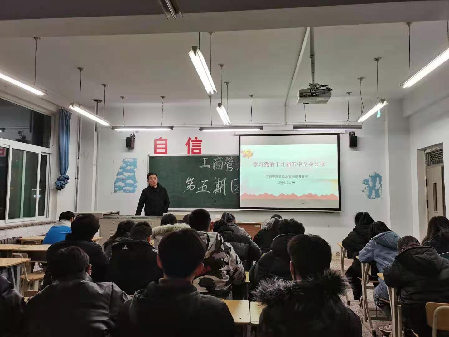 12月28日下午,工商管理系党总支副书记(主持工作)韩晋平为第五期“青马工程”培训班学员作了“开启全面建设社会主义现代化国家新征程——学习党的十九届五中全会精神”专题报告。他从全会基本情况、主要成果、逻辑主线、核心要义、主要内容等方面详细讲解了党的十九届五中全会精神,并指出我国开启社会主义现代化国家新征程必须坚持党的全面领导。