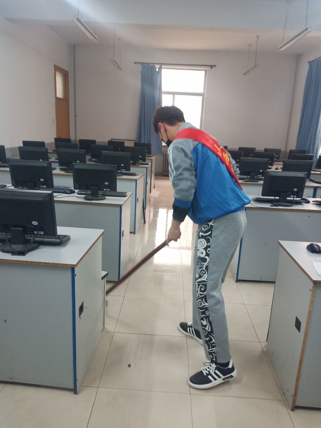 下午三点半,志愿者们准时到电教中心门口集合。在了解注意事项后,同学们领好扫帚、拖把、抹布等卫生清理工具进入一至九机房,开始扫地、拖地,擦拭桌椅、机箱外面的浮尘、窗户、窗台并摆放电脑桌椅,认真打扫机房的每个角落,尽管地面上有不少的灰尘和头发,虽然打扫起来很困难。但是,经过同学们的努力,机房呈现出了焕然一新的面貌,营造了一个干净、整洁的环境。