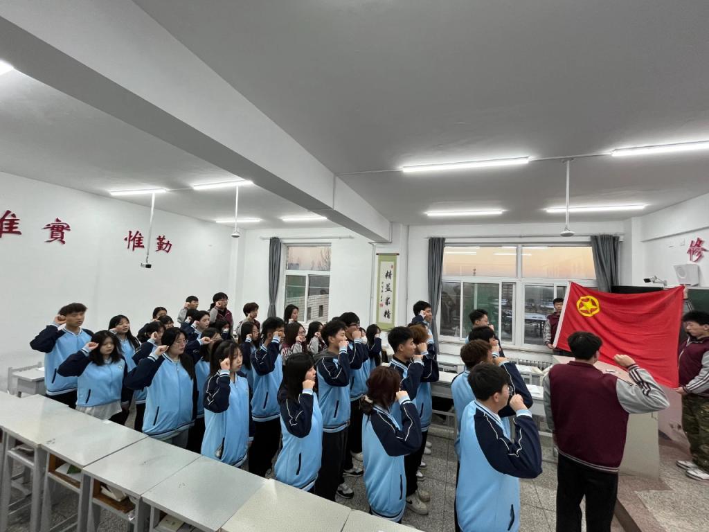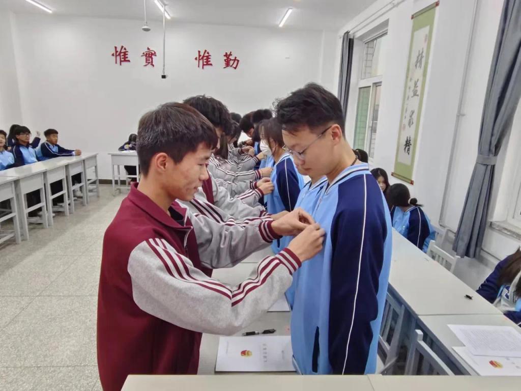 第三项:老团员为新团员佩戴团徽入团宣誓。