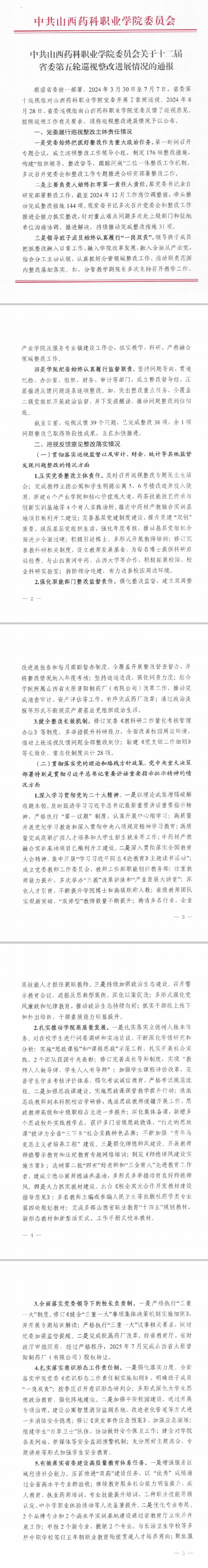 中共山西药科职业学院委员会关于十二届省委第五轮巡视整改进展情况的通报