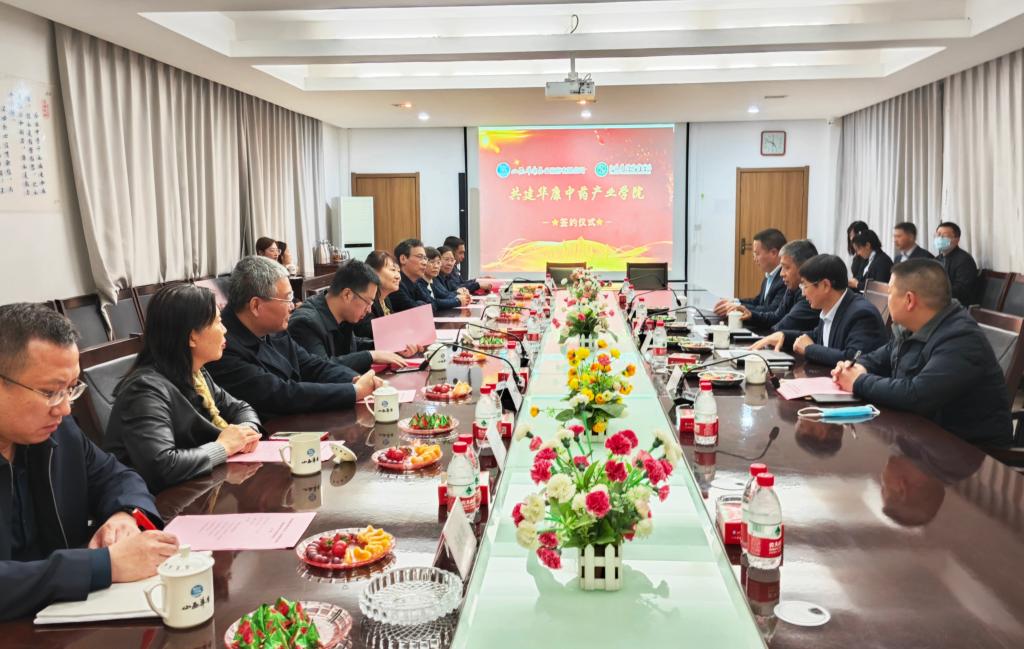 张轩萍与董光明共同为华康产业学院授牌,校企双方共同签署华康中药产业学院协议。