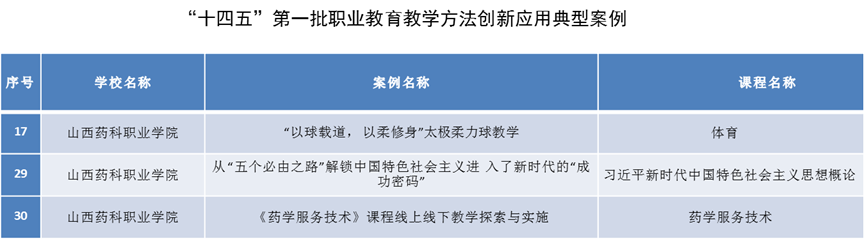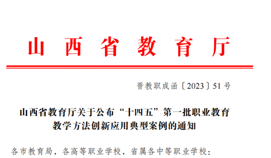 为落实全省职业教育大会精神,持续深化“三教改革”,总结和推广课程教育教学改革的经验和做法,按照《山西省教育厅关于开展2022年职业教育教学方法创新应用典型案例征集工作的通知》要求,我院积极组织教师申报职业教育教学方法创新应用典型案例。近日,山西省教育厅公布了“十四五”第一批职业教育教学方法创新应用典型案例的认定结果,我院3个案例被认定为首批职业教育教学方法创新应用典型案例,典型案例通过“ 山西省职业教育教学联盟”平台进行展示(网址:https://jzlm.mh.chaoxing.com/)。
