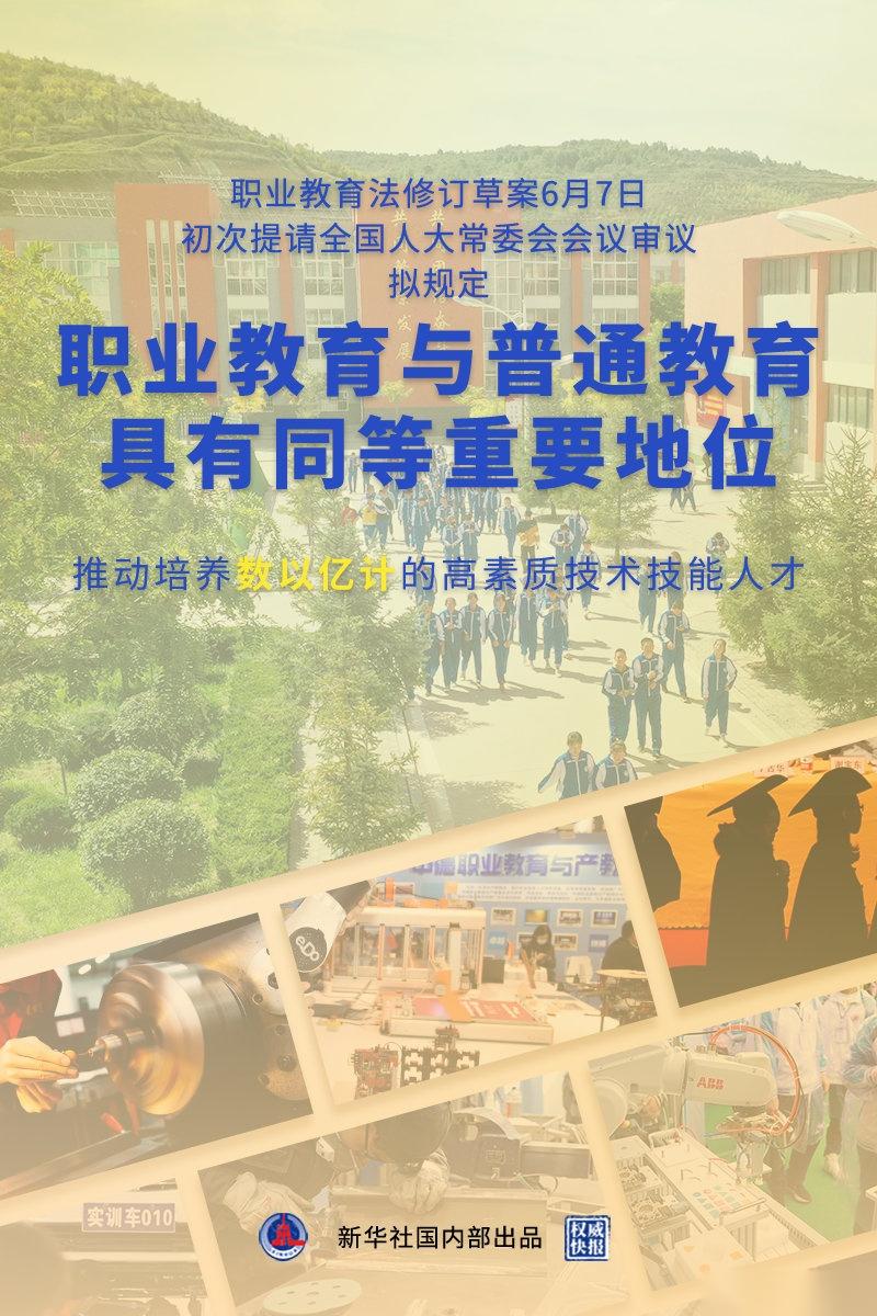 发展职业教育事关我国经济社会发展全局。职业教育法修订草案7日初次提请全国人大常委会会议审议。草案提出,职业教育与普通教育具有同等重要地位。草案着力解决职业教育领域突出问题,推动培养数以亿计的高素质技术技能人才。草案突出就业导向,缓解就业结构性矛盾和促进就业质量提升,为进一步深化职业教育改革提供法律基础。(记者余俊杰)