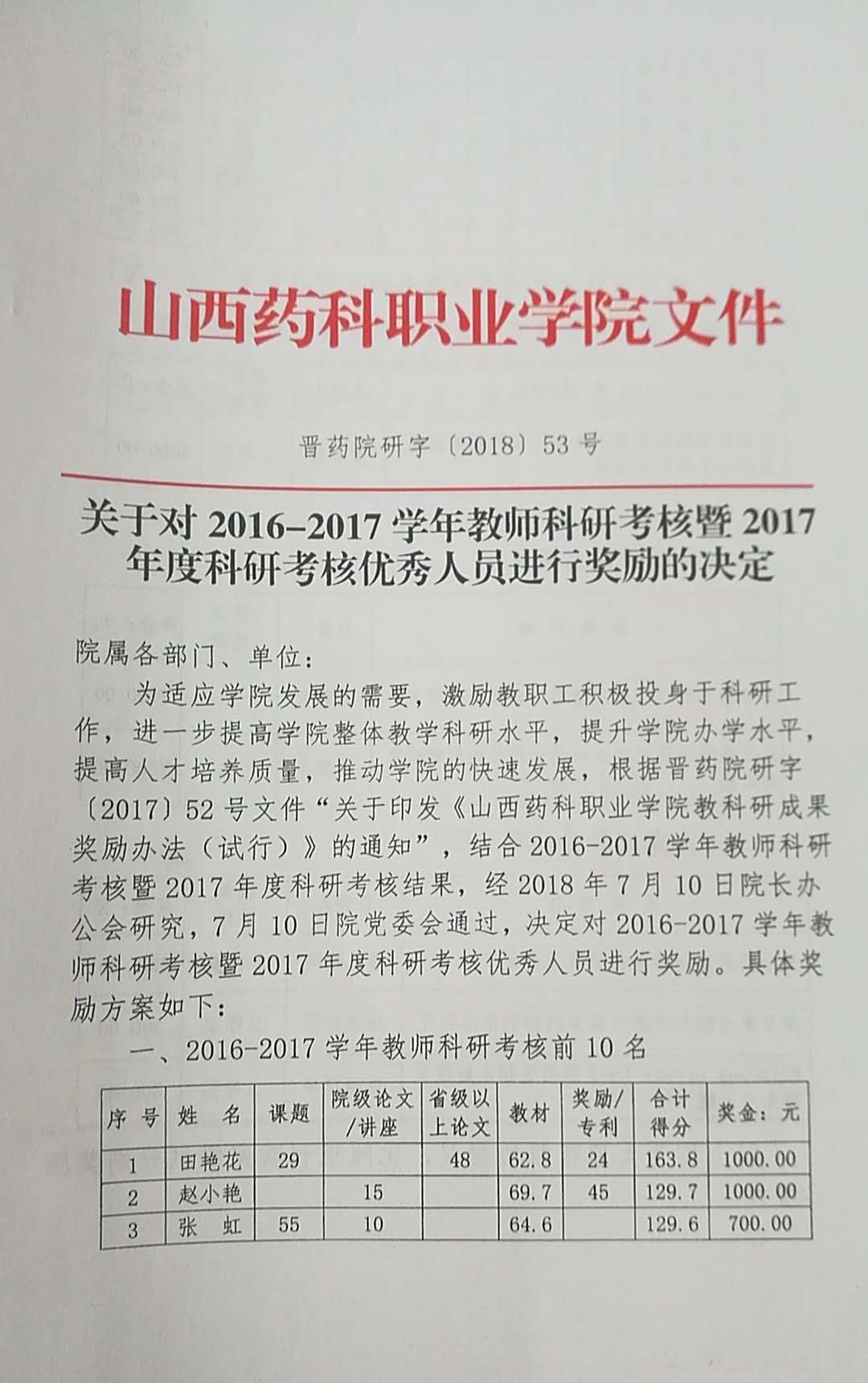 关于对2016--2017学年教师科研考核暨2017年度科研考核优秀人员进行奖励的决定