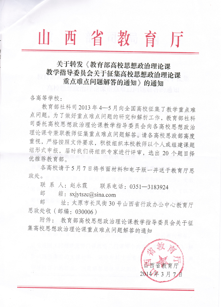按照山西省教育厅“关于转发《教育部高校思想政治理论课教学指导委员会关于征集高校思想政治理论课重点难点问题解答的通知》的通知”要求,请院各有关部门积极组织申报,在4月30日前完成材料总结工作,并将申报资料交至科研中心李世相。