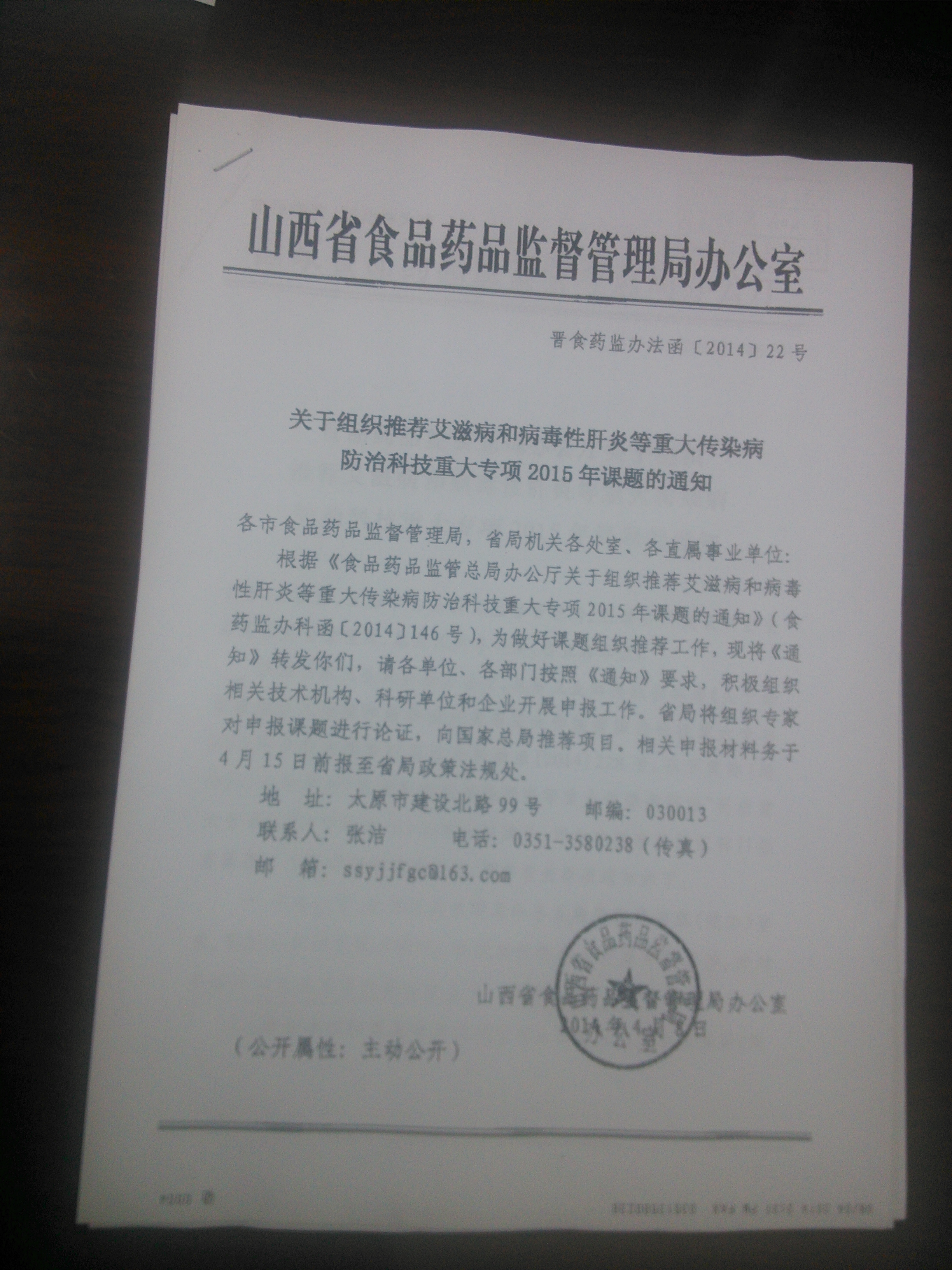 按照山西省食品药品监督管理局“关于组织推荐艾滋病和病毒性肝炎等重大传染病防治科技重大专项2015年课题的通知”(晋食药监办法函[2014]22号),为做好课题组织推荐工作,请院各有关部门、各单位按照附件3要求,积极组织开展申报工作。科研中心将对申报项目汇总审查,并向山西省食品药品监督管理局推荐。相关申报材料务与4月15日前报至科研中心李世相处。电子版发送至275119432@qq.com。