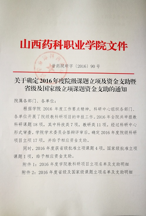 关于确定2016年度院级课题立项及资金支助暨省级及国家级立项课题资金支助的通知