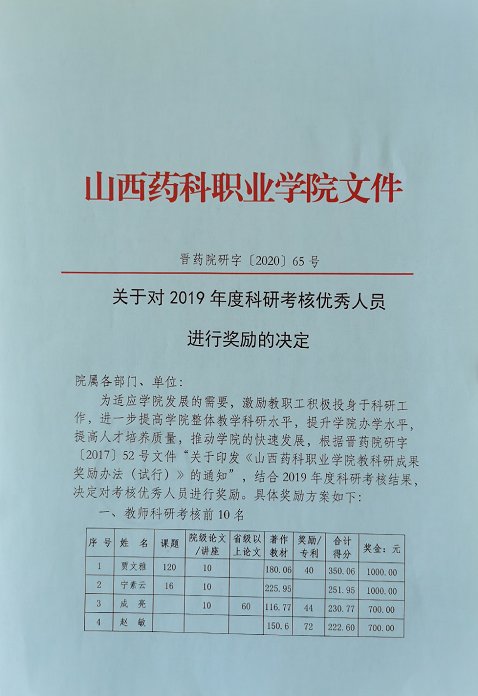 关于对2019年度科研考核优秀人员进行奖励的决定