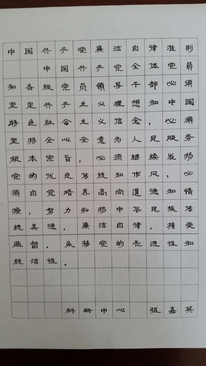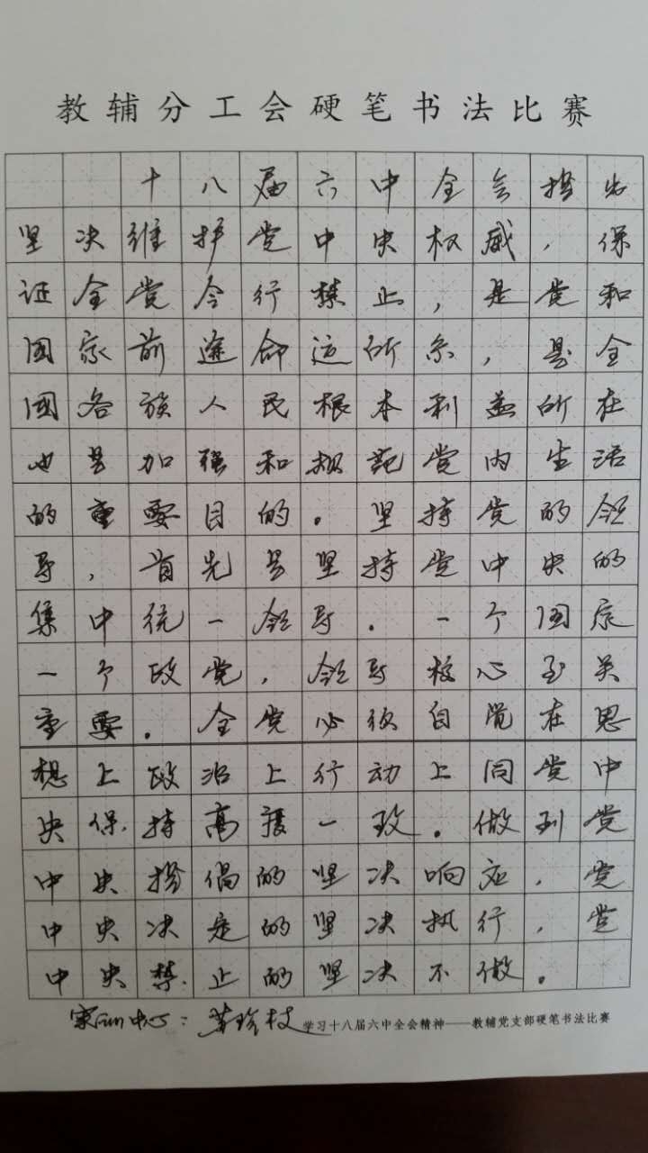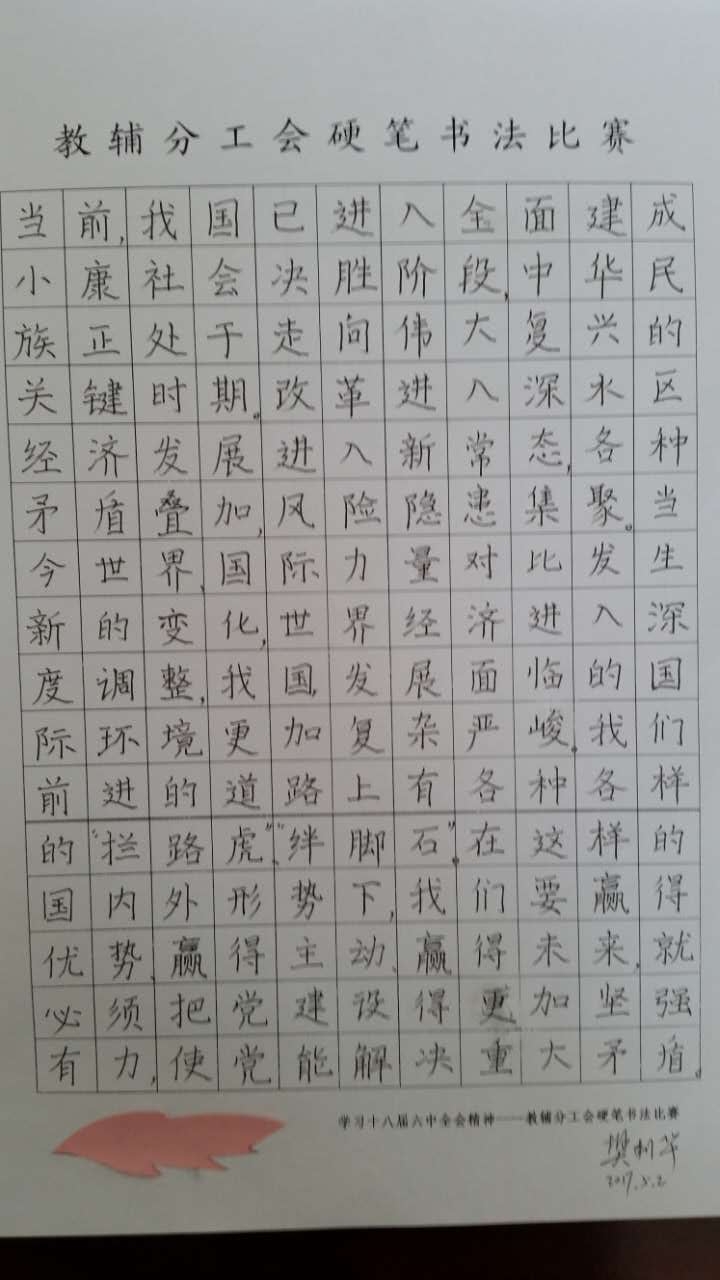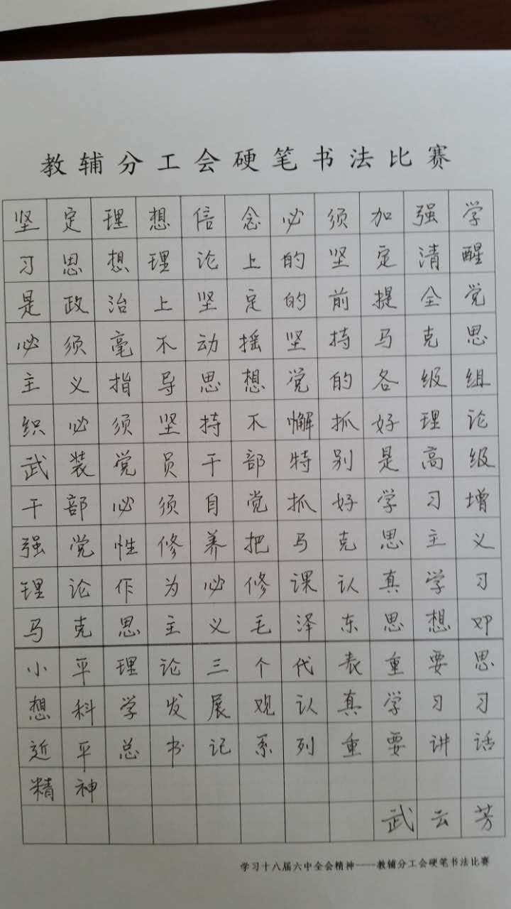 2017年4月15日~5月8日,教辅分工会根据院工会“关于开展第二届‘精业强技 教书育人’技能竞赛的通知”的文件要求,围绕党的十八届六中全会精神和党风廉政文化建设,组织分工会所有工会会员,开展“硬笔书法”技能竞赛。