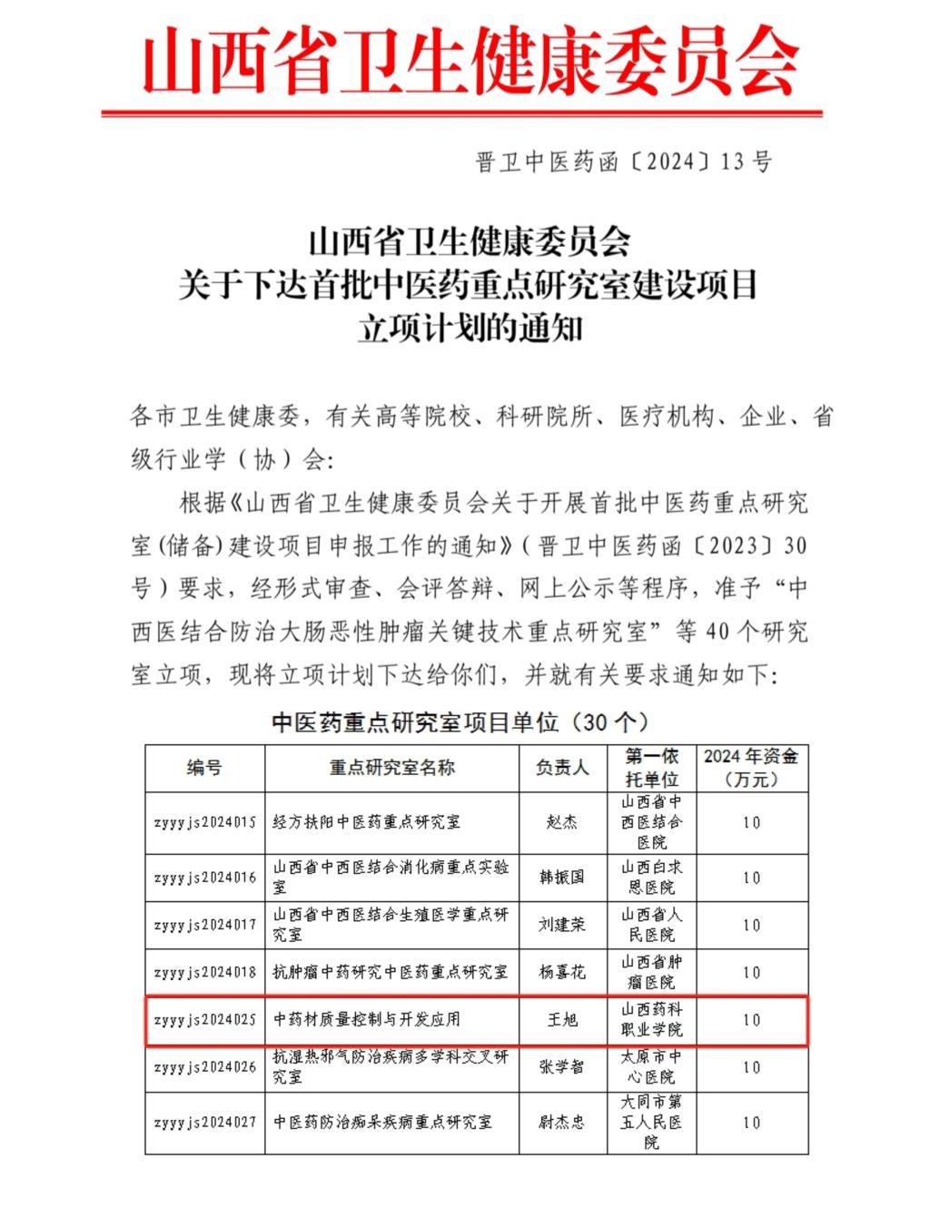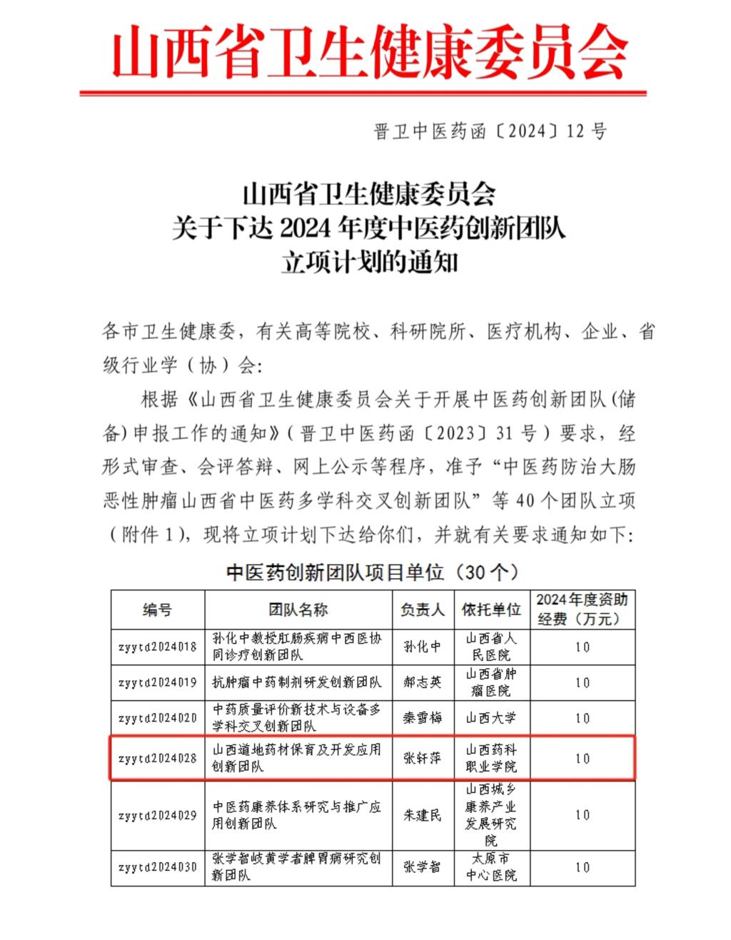 近日,山西省卫健委印发《关于下达首批中医药重点研究室建设项目立项计划的通知》和《关于下达2024年度中医药创新团队立项计划的通知》,我院“中药材质量控制与开发应用研究室”获批山西省卫健委首批中医药重点研究室,“山西道地药材保育及开发应用创新团队”获批山西省卫健委中医药创新团队。