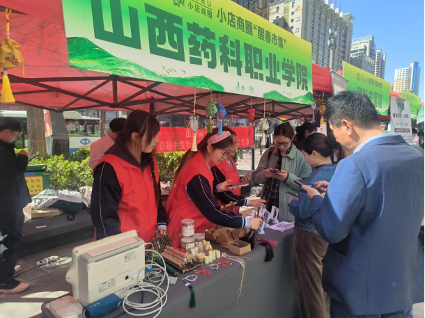 为积极响应小店区“城市养生文化进商圈”战略部署,深化中医药文化科普推广,提升学院社会影响力,2025年4月1日至2日,学院科研服务中心精心组织中药系、医疗器械系师生,携“十大晋药”及科创产品,亮相太原市小店区首届“醒春市集”暨中医药文化宣传周活动。