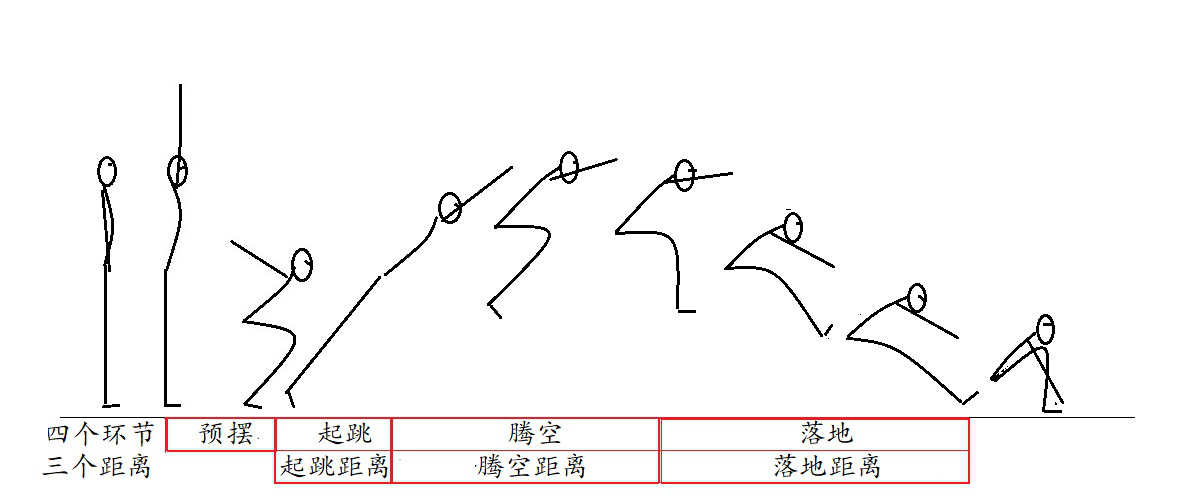 根据学习、研究、访谈等过程,把立定跳远整个技术动作过程分解为预摆、起跳、腾空、落地四个环节。