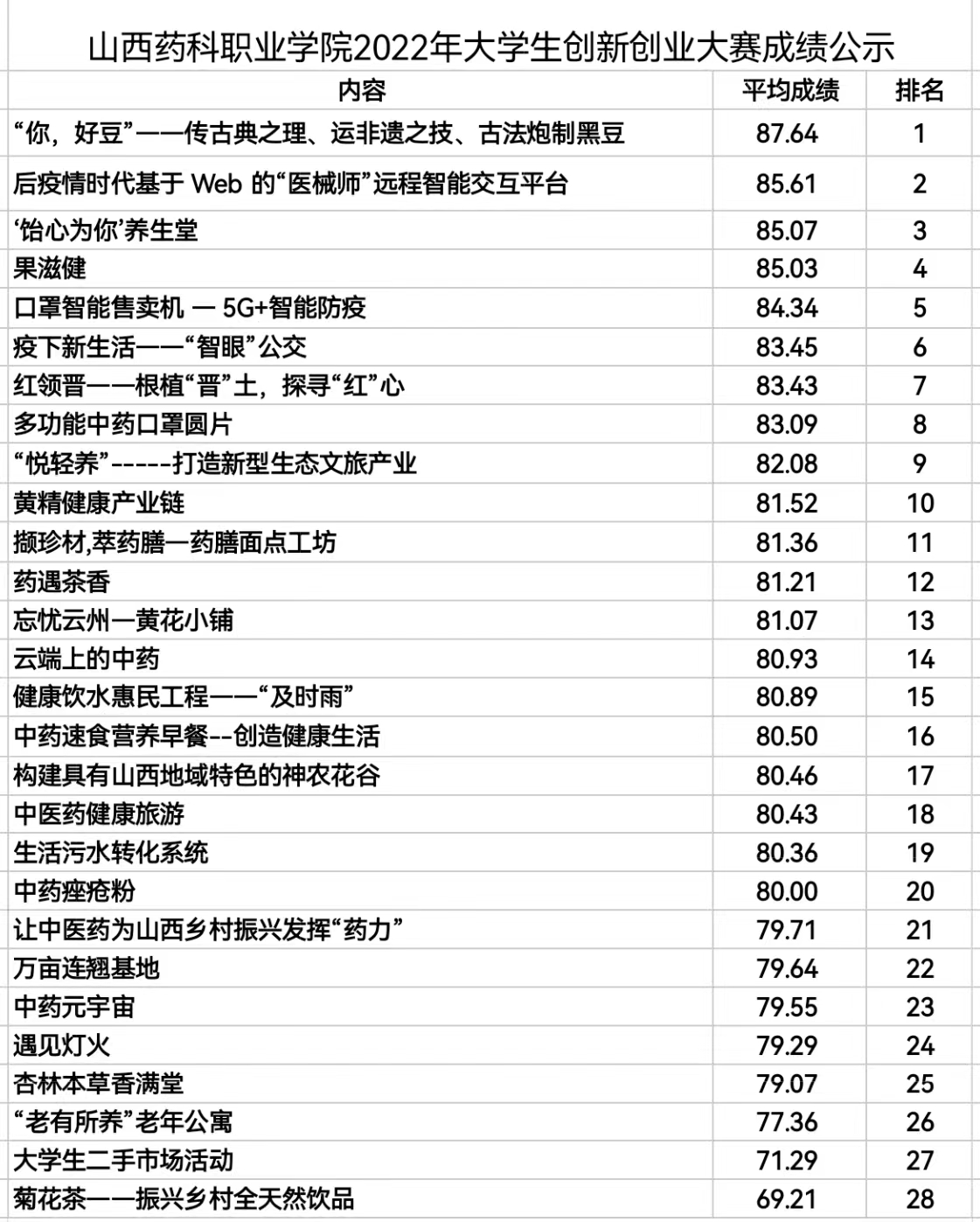 根据《山西药科职业学院关于举办2022年大学生创新创业竞赛的通知》要求,我院团委于5月30日通过腾讯会议线上举办了2022年大学生创新创业竞赛决赛。现将比赛成绩排名予以公示: