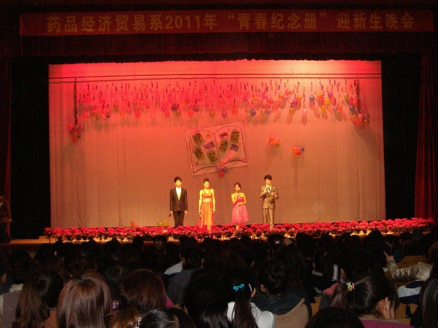 10月24日晚7点半,由药品经济贸易系团总支主办的2011级迎新晚会如约在大礼堂拉开帷幕。晚会的主题为“青春纪念册”。药贸系全体师生观看了演出。