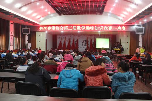 2013年12月4日中午1:00,我院数学建模协会在文体中心举办了第三届数学趣味知识竞赛决赛,基础部主任徐荣辉、指导老师王剑红、郭华毅、杨素芳、院团委柴红萍及100名学生参加本次活动。