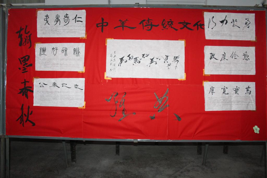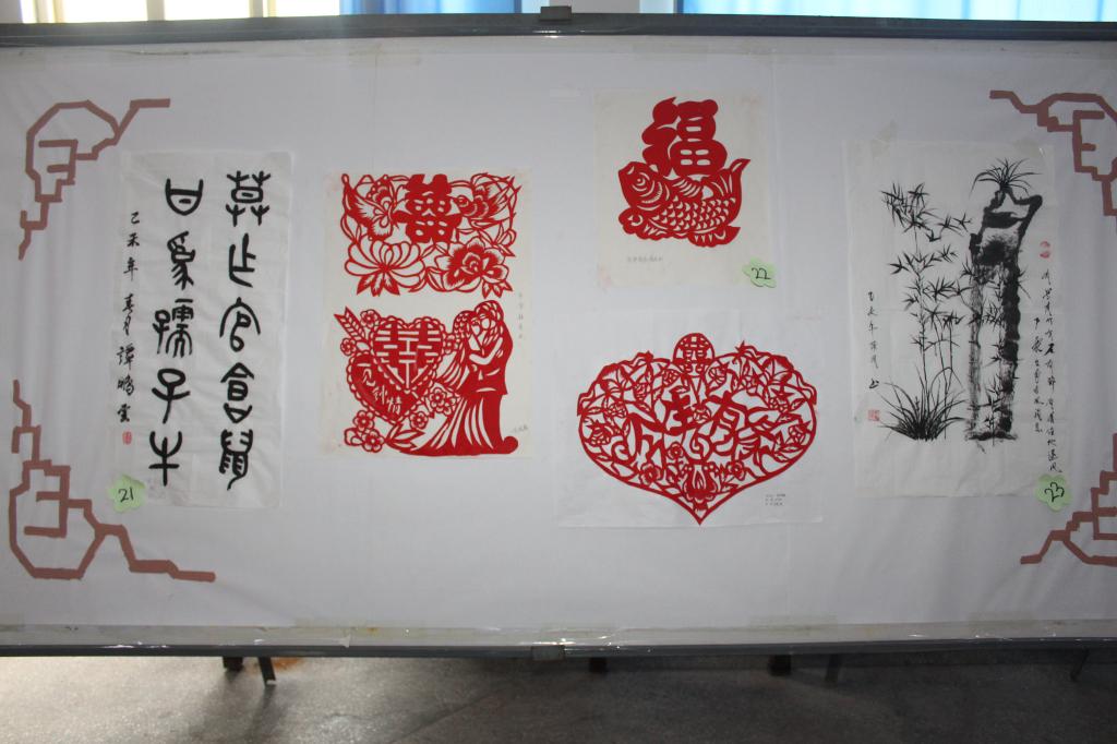 本次中华传统文化展分为传统饮食、建筑、服饰、民俗、国学、手工艺、曲艺七个部分。经过前期的认真筹备与作品征集,共有44件作品入选本次展览,其中包括书法、国画、剪纸、面塑、京剧脸谱等,作品风格各异,设计精巧细致,大气简约,极具中国传统特色。