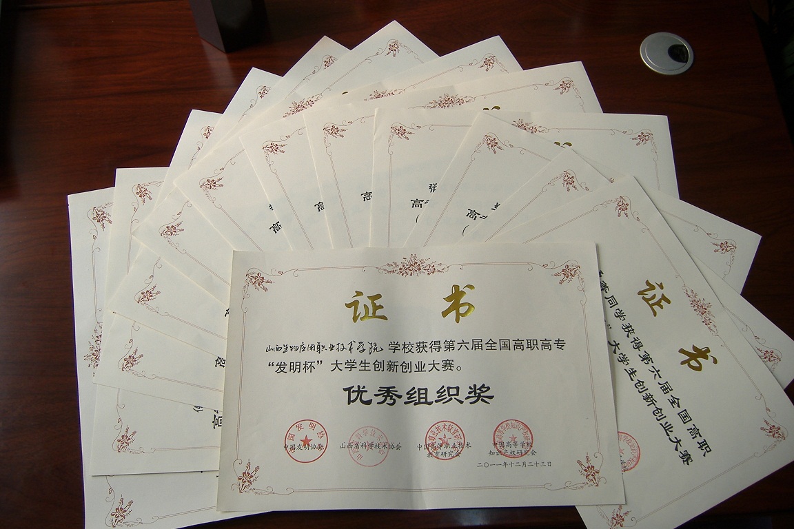 由中国发明协会、国家知识产权局人事教育部、中国高等职业技术教育研究会、中国高等学校知识产权研究会联合举办的第六届全国高职高专“发明杯”大学生创新创业大赛近日在山西财税高等专科学校落下帷幕。我院团委组织选送学生作品12件,有11项在大赛中获奖,其中获发明类一等奖1项,创业类二等奖2项,创意类二等奖6项,创意类三等奖2项,卫军锋、高淑红等教师获优秀辅导教师奖,学院获优秀组织奖。
