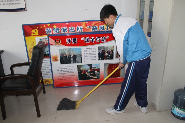 活动中,同学们有的扫地、有的擦桌子、有的拖地,忙得不亦乐乎,大家的劳动也赢得了派出所民警的一致好评。