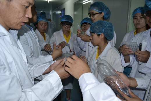 6月18日上午,在公司会议室,诺成制药大学生暑期社会实践团在观看了该公司宣传视频的基础上,实地参观了该公司的“吹瓶—灌装—封口”三合一塑料水针生产线、药品检测中心。通过实地参观学习,使大家切身体验到医药企业的生产流程和岗位实际操作规程,并将在学院所学到的理论知识与企业实践有了初步结合。同时,身临企业环境,切身体验企业文化,深刻领悟该公司的“能者上,庸者让”的企业文化精髓,并在文化熏陶、环境营造过程中受到潜移默化的教育。