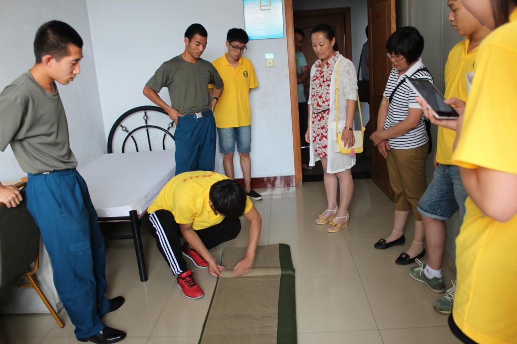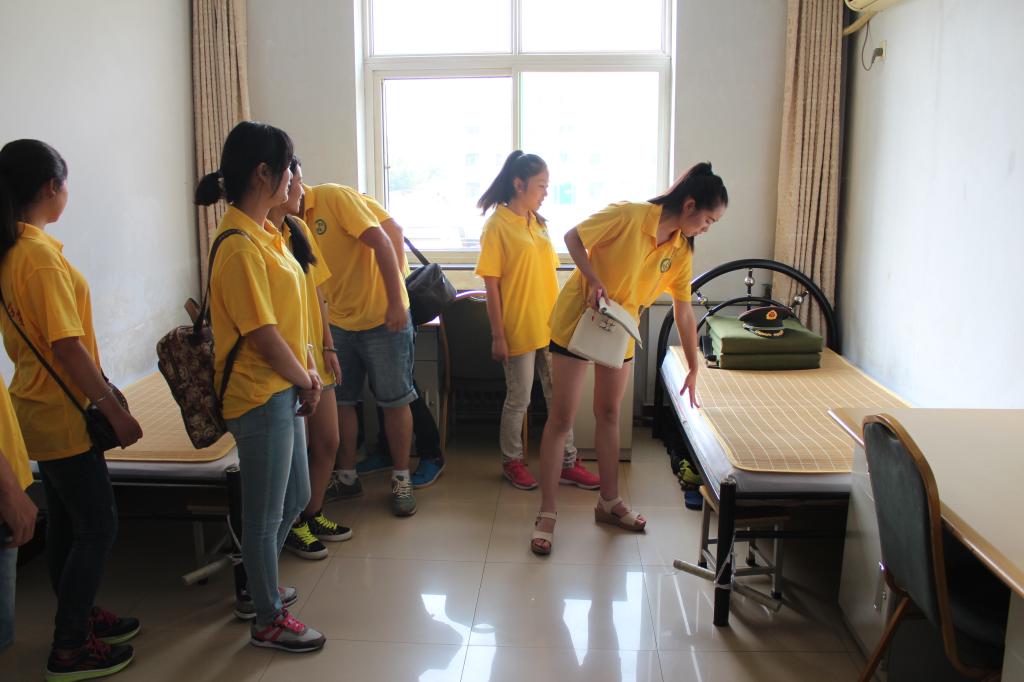 经过半个多小时的车程,实践队员们顶着炎炎烈日来到了驻地,受到了部队官兵热情的接待。首先,在部队领导的带领下,实践队员来到战士们的宿舍参观了内务,每张床铺上方方正正的被子、整齐有序的物品无一不让队员们赞叹,部队的官兵还现场向大家展示了叠军被的过程,并针对动作要领给队员们进行了讲解。虽然实践队员在军训的时候都有过相关的学习,但像这样系统全面地参观和学习部队的内务还是第一次。随后,实践队员同部队官兵开展了联欢活动,歌舞、长拳、搏击等节目精彩纷呈,亮点不断。战士们和实践队员还来了个街舞现场“PK”,各具风格但同样精彩。最后大家合唱一首《兄弟抱一下》,真正体现了军民鱼水一家亲。