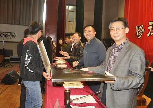 图为领导为获得社会实践活动特殊贡献奖的单位颁奖