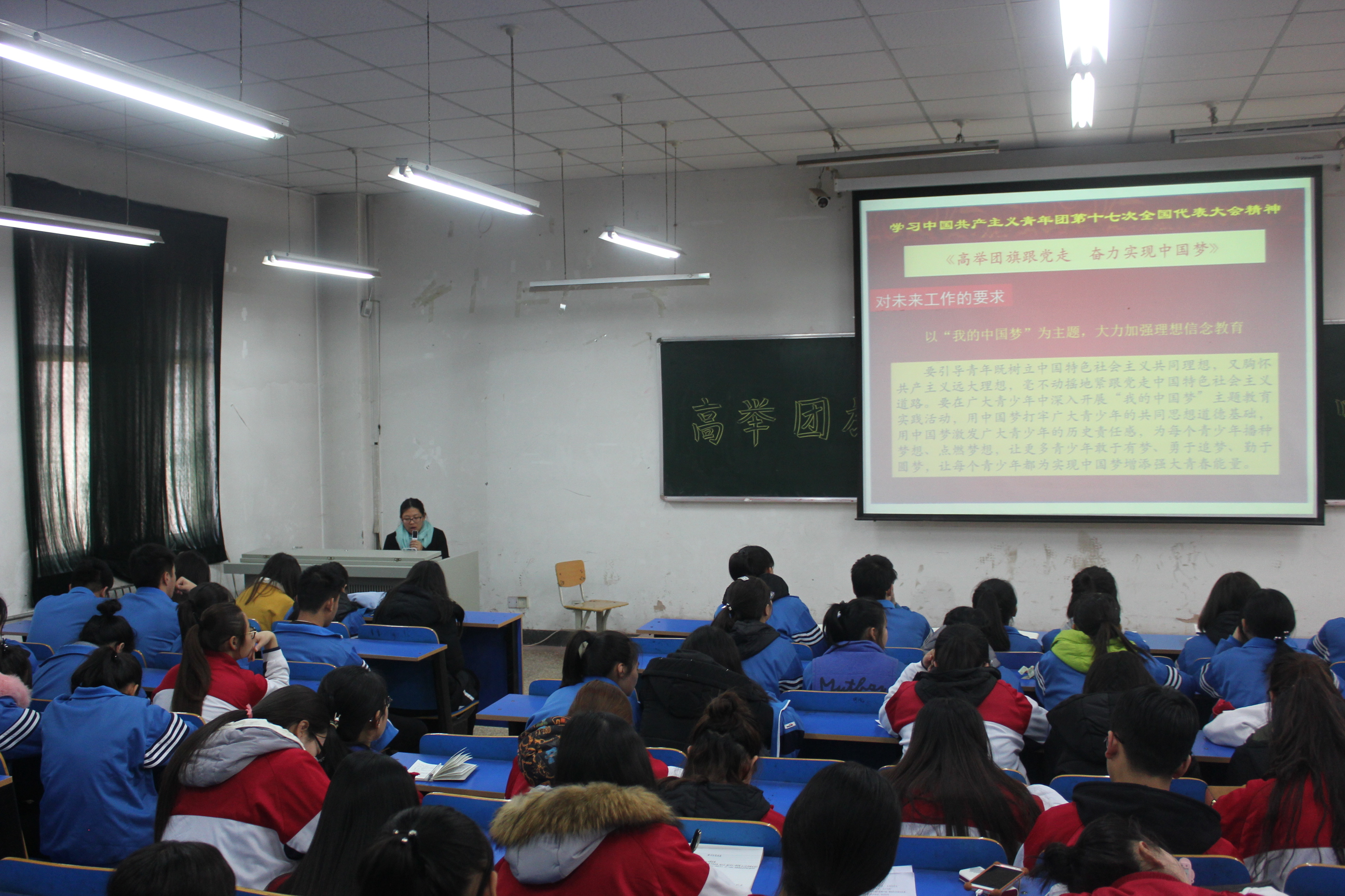 王艺芳同志阐述了《团章》总则以及团旗、团徽、团歌、团员证的意义和团成员的各项职责义务,重点解读了代表团十七大精神的两个重要讲话,最后提出了争做“有责青年、有德青年、有爱青年”的要求与大家共勉。