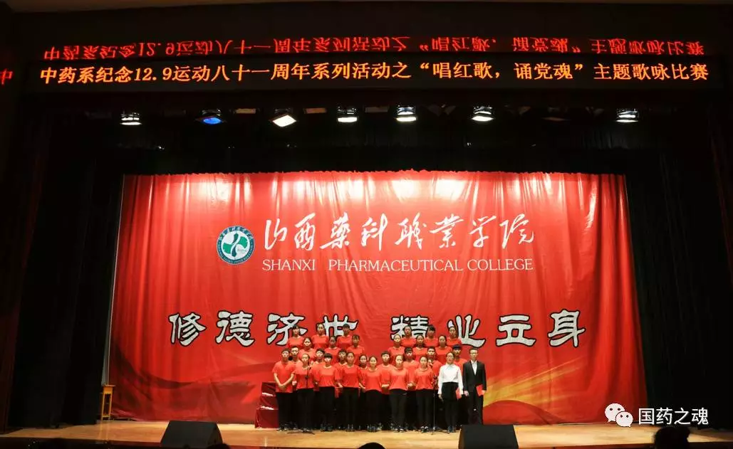为纪念12.9运动八十一周年,重温历史岁月,弘扬爱国主义精神,营造积极向上的校园文化氛围,2016年12月9日1,由中药系分团委主办的“唱红歌,诵党魂”主题歌咏比赛顺利开展,此次歌咏比赛作为纪念“一二·九”运动系列活动的一个项目,取得了圆满的成功,院学生会常务副主席程丽纲,院团委组织部部长杨璐,院团委宣传部部长王蓉以及中药系全体学生齐聚大礼堂,共同欣赏精彩比赛。