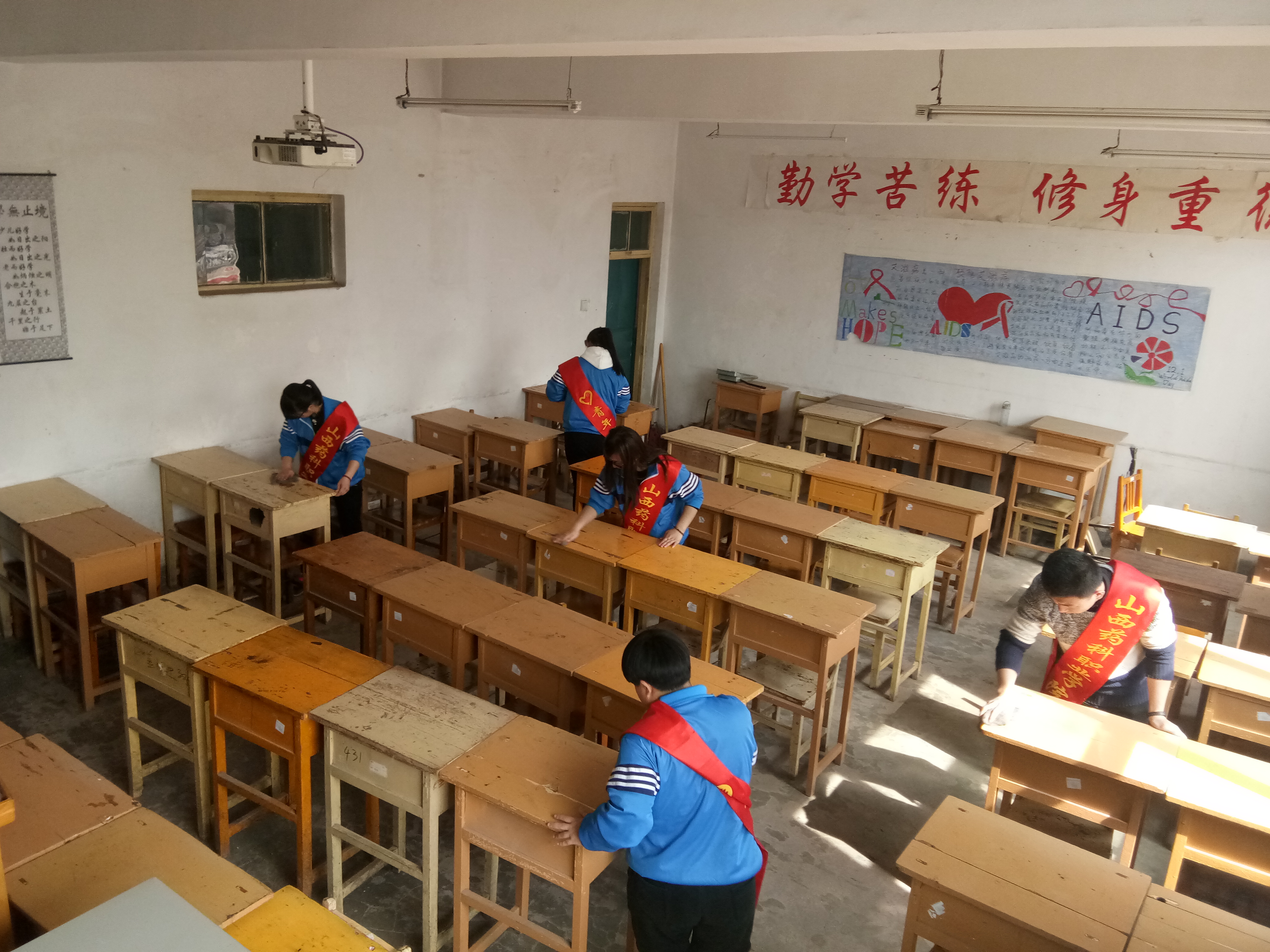 我院教室的课桌上有很多深深浅浅的印记,最常见的是一些小广告,还有大家在上课时随手写下的一些心情语录和一些率性的涂鸦,严重影响了桌面的美观、教室的卫生。活动开始前,志愿者们分发清理工具、安排好各自的分工。活动期间,志愿者们认真积极,他们用橡皮擦擦掉字迹,并用抹布将桌面和桌子抽屉,凳子擦洗干净。对于那些污迹满布的课桌,同学们反复多次擦拭,丝毫没有厌烦和怨言。他们的积极工作让教室焕然一新,也让我们有一个更加舒适的学习环境。志愿者们的辛勤劳动不仅是为了践行雷锋精神,更为建设美丽校园贡献自己的一份力量。