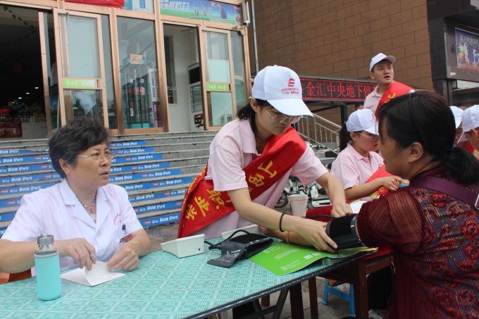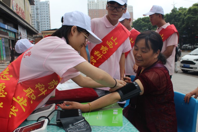活动刚开始不久,就有不少中老年人闻讯赶来,围在志愿者身边,询问健康常识。活动中,实践队员们在主任医生的教导下,积极开展安全用药知识宣讲以及义务测量血压的活动,为群众们免费提供服务。实践队员们逐一为老人们测量血压,并且根据所学知识,对他们提出的“高血压、糖尿病患者在饮食方面应注意什么?”、“购买药品时要怎么挑选?”等问题,一一作了详细解答。实践队员们的耐心与热情受到了广大居民的一致好评。