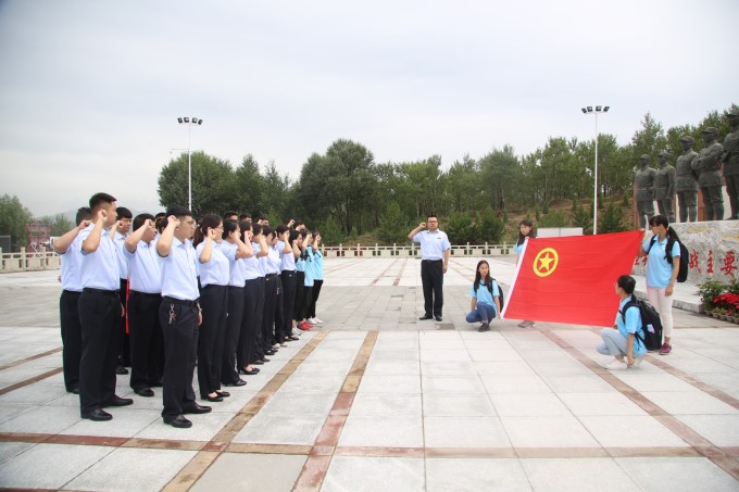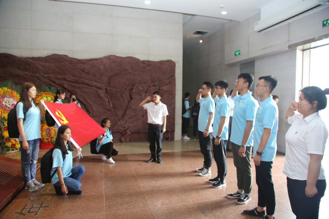 参观结束后,实践团全体学生团员和晋银公司团员们面向团旗庄严宣誓。实践团临时党支部书记李一奇和教师党员张海瑞在光荣的英雄纪念雕像前朗诵爱国诗歌《不朽的军魂》,为学生党员佩戴党徽,并带领大家重温入党誓词。张海瑞同志还为党员实地讲授党课。活动最后,全体队员高唱红歌。