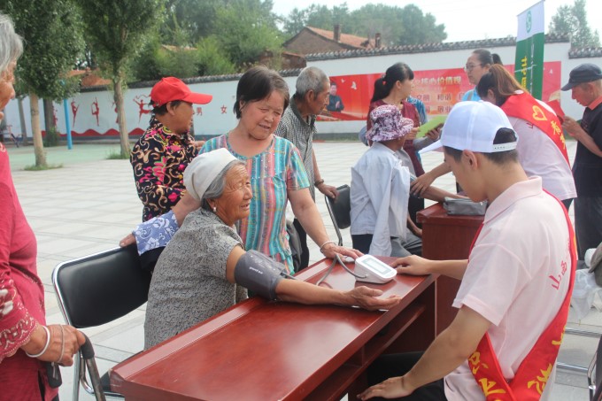 高墙框村作为右卫镇最大的村,老年人居多,针对这一实际情况,本次医药健康服务以义务测量血压和医药常识宣讲的形式开展。村民们集聚在村广场,实践队员们一一为他们测量血压,并讲解和发放“如何科学测量血压”“夏季养生常识”等宣讲资料。碰到血压较高的村民,实践队员们还会提醒他们注意改善饮食和生活习惯,积极控制血压,遵医嘱服用降压药。在志愿服务的过程中,队员们自豪地向村民们介绍和推荐我们学院,并欢迎家中考生报考山西药科职业学院。