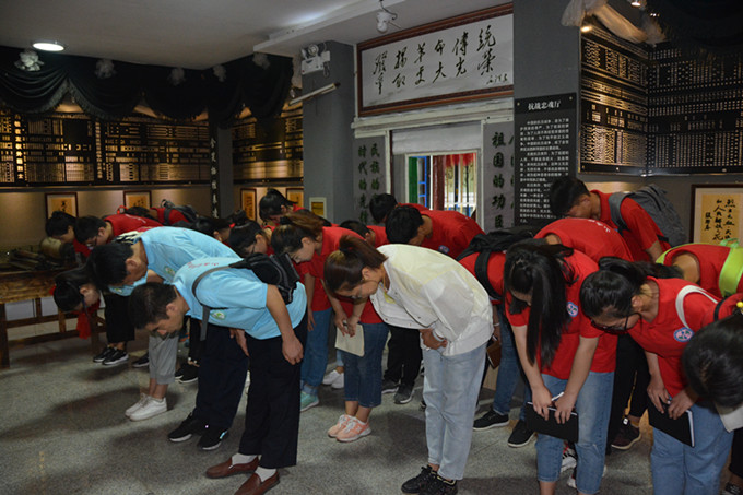 辽县抗日战争纪念馆内所陈展的藏品多为当年辽县抗战的实物、图片和文字资料。一件件藏品静静地陈列在展柜里,无声地诉说着顽强的辽县人民抗击侵略者的艰难、勇敢和智慧,披露着当年日本侵华战争的一幕又一幕罪行。讲解员说道:“在抗日战争中左权县村村寨寨有烈士,家家户户有参军。”这种为民族抛头颅、洒热血的奉献精神使队员们不时为之震撼。随后,队员们在烈士灵堂前默默肃立,并向英雄先烈鞠躬。