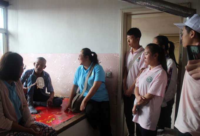 7月14日上午,赴右玉社会实践团一行来到右玉县北辛窑村,慰问看望住在这里的植树劳模伊小秃老人。
