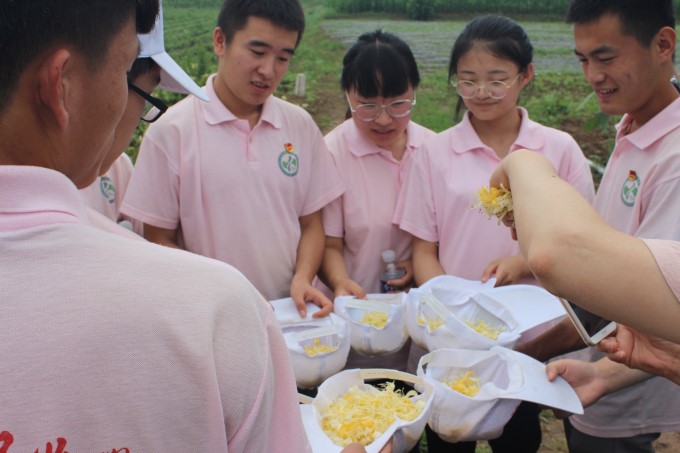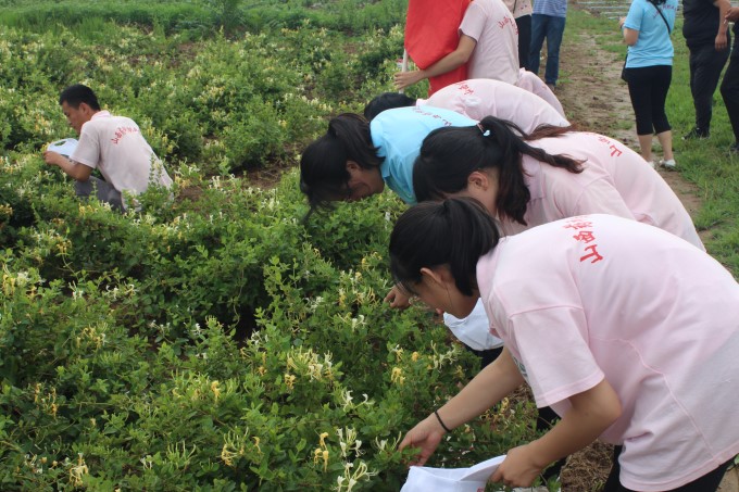 在种植园,实践队员们边走边问边学习,时不时拿出手机查阅资料。百姓药业杨卫红会计和带队老师向实践队员们介绍了基地种植的各种药材的生长习性和特点,以及中草药的药用价值和功效等。踏着雨后的湿土地,伴着阵阵花香,实践队员们亲手采摘了金银花,看到自己丰硕成果,队员们脸上都乐开了花!